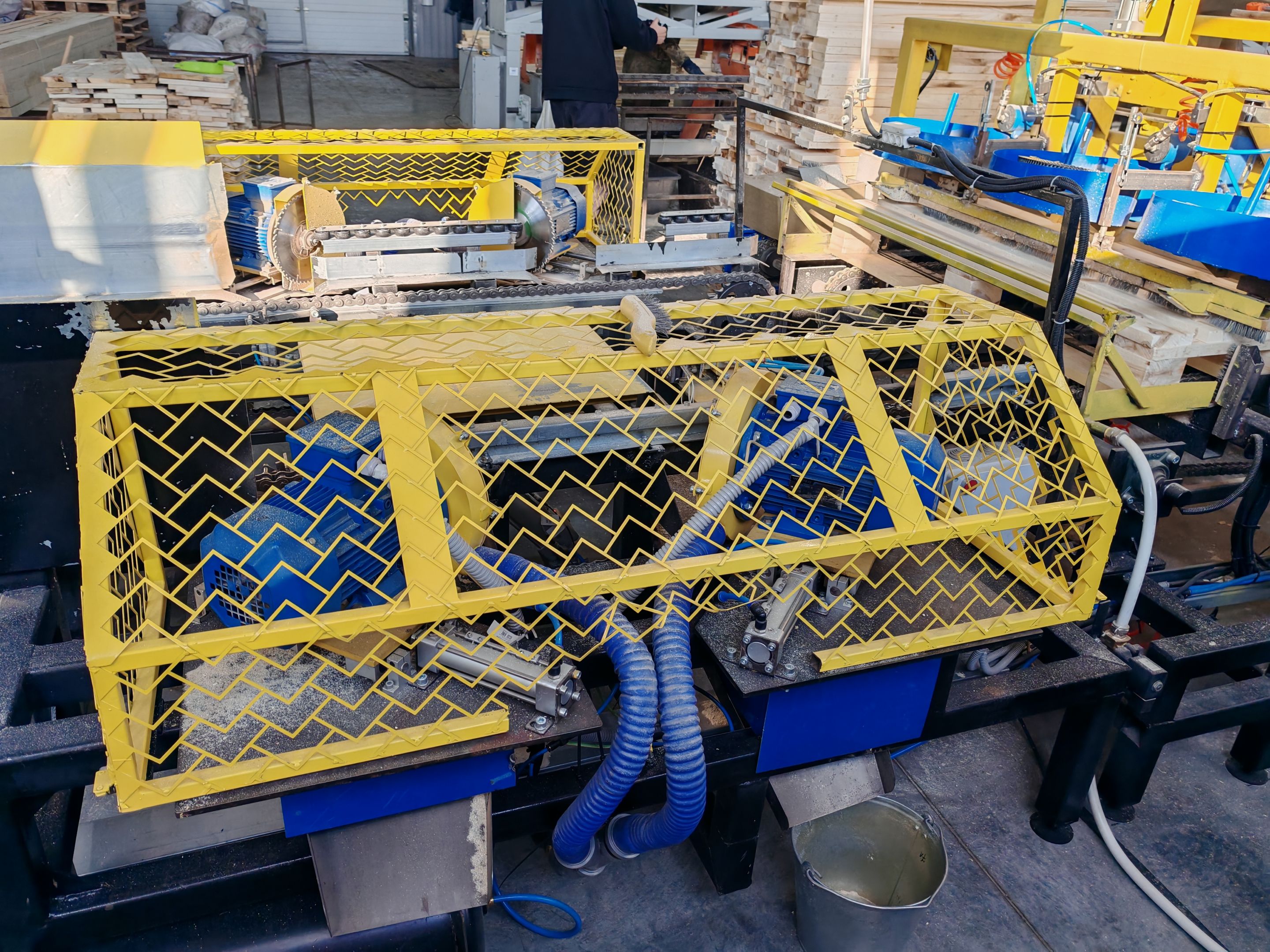 - Узел фрезеровки/ маркировки/ переворота (торцует углы поддонов циркулярными пилами, выполняется